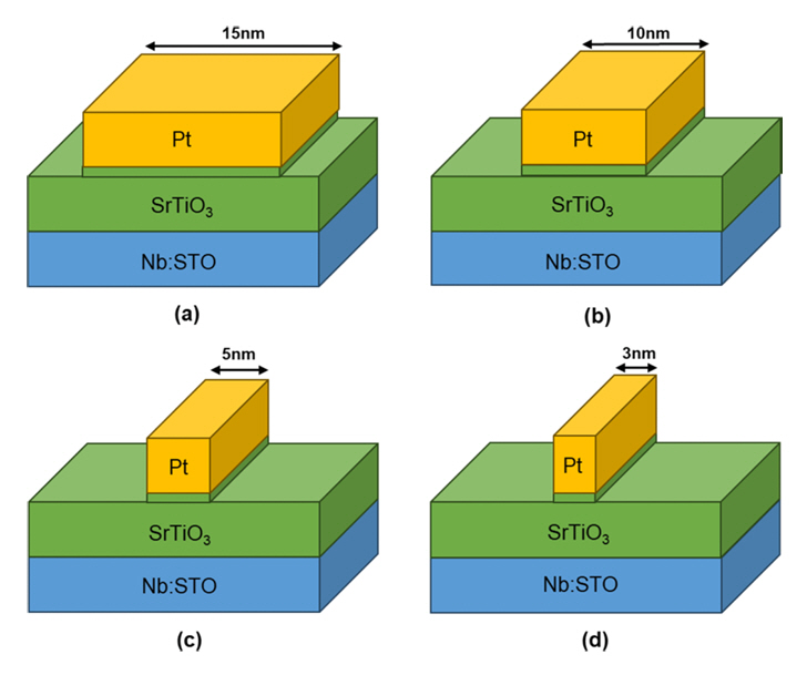 크기의 Pt 상부 전극들을 만든다[12]. 실제 소자는 두께는 수나노미터(nm)에 불과한 반면, 폭은 마이크론이지만, 이것을 그대로 시뮬레이션 구조로 만드는 것은 비효율적이다. 따라서,