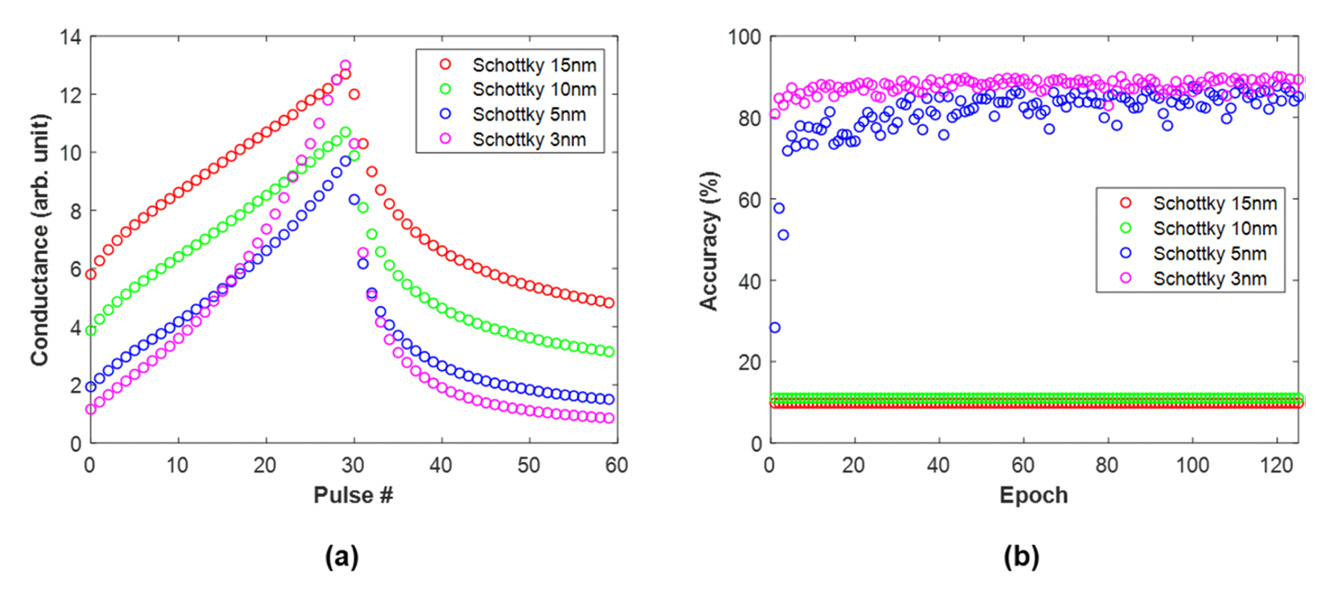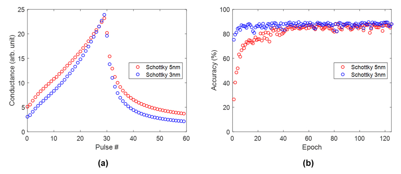 소자 특성을 시뮬레이션하고, 이를 신경망 회로 시뮬레이터인 NeuroSim에 반영하여 MNIST 패턴 인식률을 얻었다[15-17].