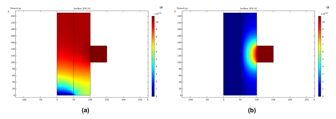 상부 전극 Pt에 인가된 전압 펄스에 따라 먼저 수식 2의 푸와송(Poisson) 방정식을 풀어서 소자 내의 전기 포텐셜 분포를 얻는다. 이는 매 시간스텝(time step)에서 진행된다.
