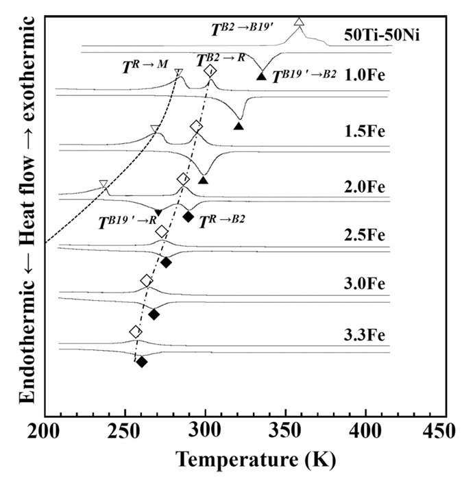 1. Fe 조성의 증가는 TB2→R, TR→B19' 모두를 감소시킨다. DSC결과 1.0at%Fe 증가함에 따라 TB2→R, TR→B19'는 각각 19 K, 51 K 감소한다. Fe 조성 증가에 따라 TB2→R, TR→B19' 간의 폭이 증가하므로 R상이 안정적이게 된다.