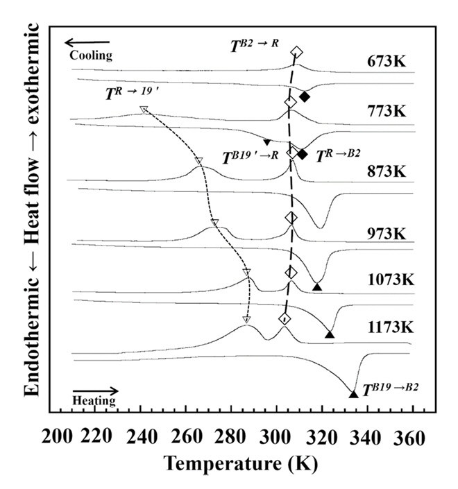 작은 히스테리시스를 나타내는 것으로 보아 전형적인 B2↔R변태로 보인다. 673 K 열처리 재에서의 R→B19′변태 온도가 매우 낮아 기계적 한계로