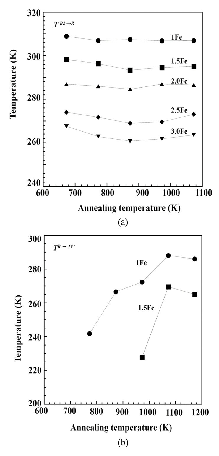 Fig 4는 Fe 조성별로 열처리 온도가 TB2→R(a) 및 TR→B19′(b)에 미치는 영향을 나타내었다.