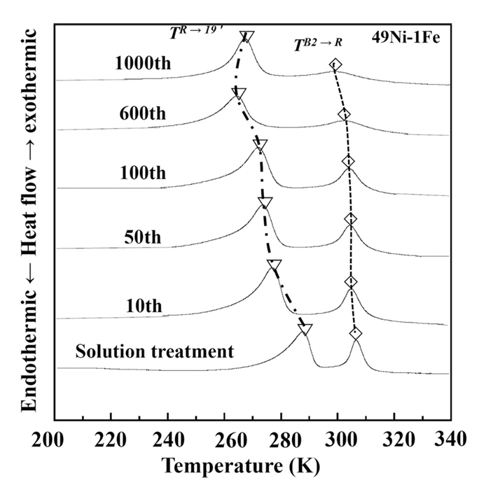 나타내었다. 용체화 처리된 합금은 냉각 시 두 개의 피크가 관찰되는데, 이는 앞서 설명한 것과 같이 고온의 피크는 B2→R변태, 저온의 피크는 R→B19'변태로