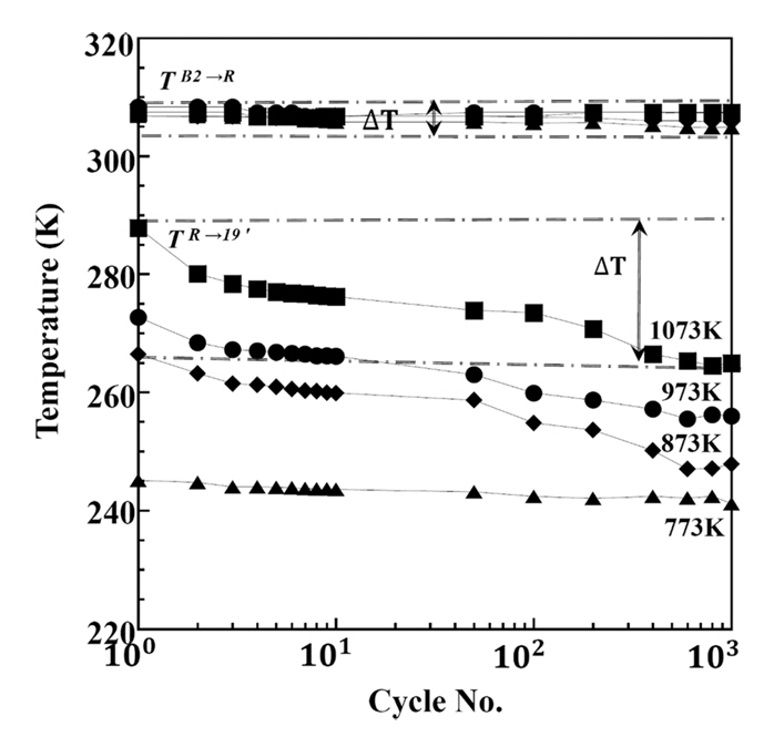 TR→B19'의 경우 873 K 이상의 고온 열처리재는 열싸이클 횟수 증가에 따라 감소하다가 포화되는 경향을 보인다. 반면 773 K 저온 열처리재는 열싸이클에