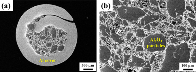 Al-Al2O3 와이어의 단면 이미지를 그림 1에서 확인할 수 있으며, 중심부의 세라믹 Al2O3 입자를 외부의 금속 Al 와이어가 감싸고 있는 코어드 와이어 형태를 볼 수 있다. Al2O3 입자는 매우 넓은 크기 분포를 가지고 있으며 전체적으로 각진 형태를 가지고 있다. 참고시편으로 활용하기 위하여 상용 Al (Al-wire A1070)