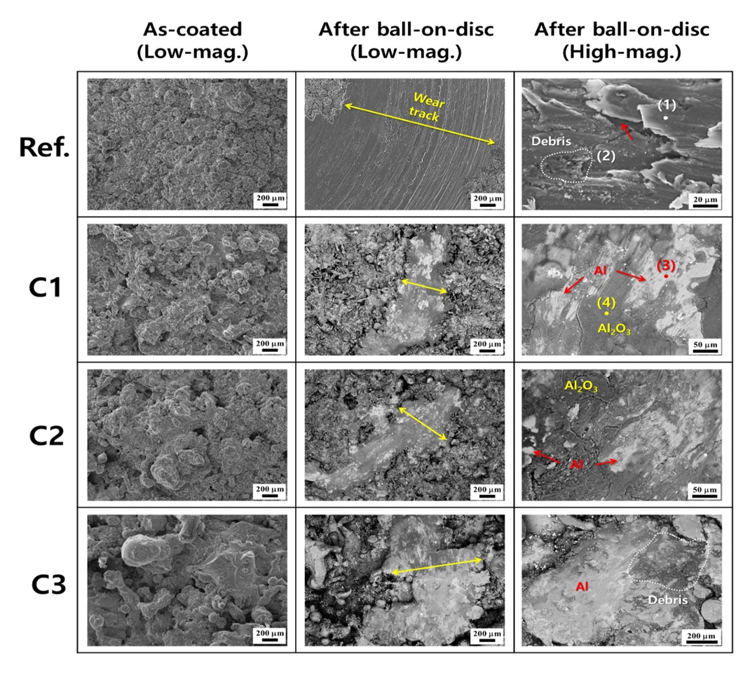 그림 10은 ball-on-disc 마모실험 전후의 코팅 표면 미세 구조 형상을 나타낸다. 가장 좌측인 1열에 표시된 코팅 직후 표면 형상을 통해 Al(Ref.)