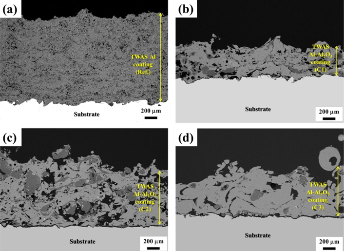 그림 4는 TWAS 코팅 직후의 Al 및 Al-Al2O3 코팅의 저배율 단면 미세구조 이미지를 나타낸다. Al 코팅(Ref.)의 경우, 평균 코팅 두께는 1355 ± 33 µm로서 다소 후막이 적층되었다.