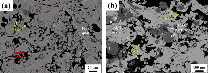 발생하기 매우 어렵다. 이러한 제한적인 가열로 인하여 대부분의 Al2O3 입자는 완전 용융 상태로 존재하지 못하고 표면부만 국소적으로 용융된 부분용융 형태로 적층된 것으로 보인다. 다만 일부 미세한 Al2O3 입자의 경우 납작한 스플렛 형태로 존재하는 것을 볼 수 있는데, 이러한 미세 Al2O3 스플렛이 코팅에 적절히 분포함으로서 코팅의 전체적인 특성을 향상시킬 것으로 예상된다.