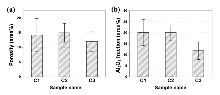 그림 6은 단면 SEM 이미지를 통해 이미지 분석을 수행한 결과를 나타낸다. 그림 6(a)에 나타낸 코팅 내의 기공도 측정 결과, C1, C2, C3는 각각 14.2 ± 5.7, 15.0 ± 3.2, 12.1 ± 3.5 area%를 갖는