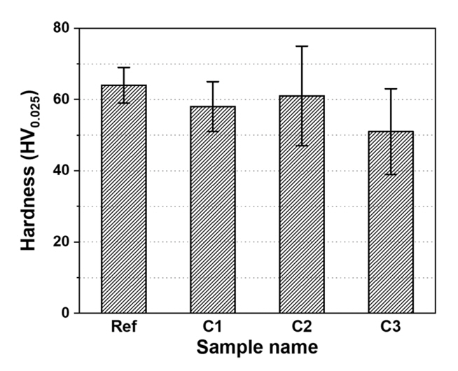 나타내었다. C1과 C2는 각각 58 ± 7, 61 ± 14 HV로 참고시편과 비교하여 소폭 감소하였다. C3는 본 연구에서 가장 낮은 수치인 51