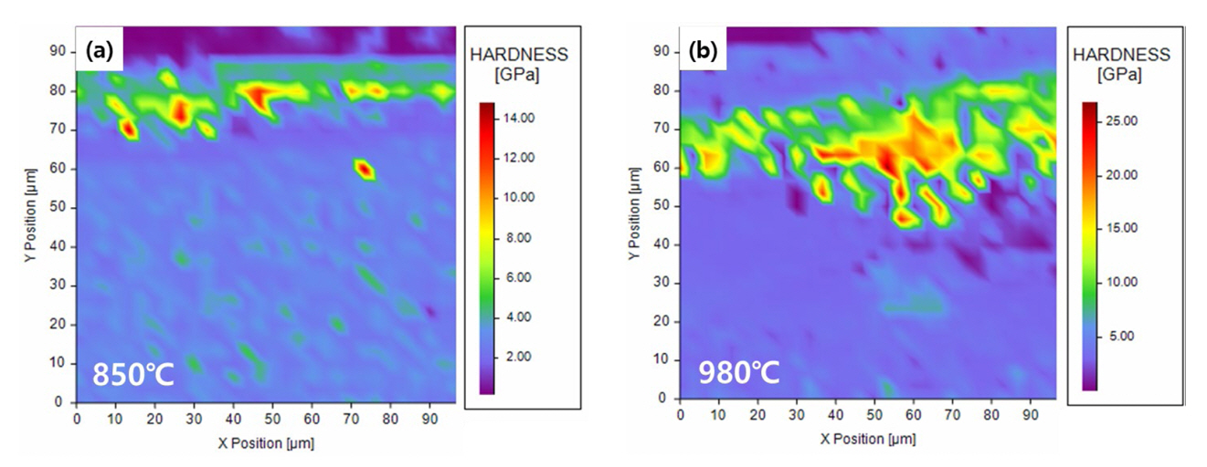 그림 10은 850°C와 980°C에서 1000시간 동안 고온 산화 실험을 한 시편의 단면을 나노압입시험을 통해 얻은 경도 값의 맵핑 결과이다. 경도 맵핑