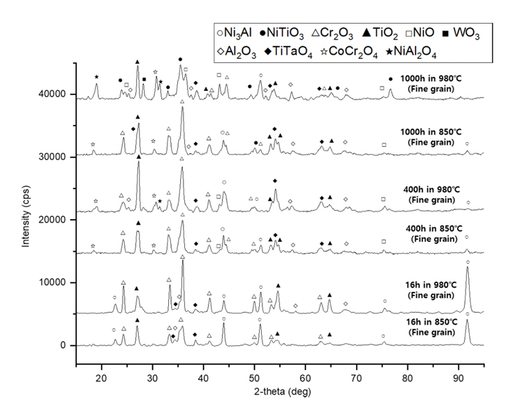 가장 안쪽 내부 산화물인 Al2O3가 불균일한 형태로 변화하였다. 또한, 조대 결정립 시편의 경우 외부 산화층이 박리되어 Ni-Al-O 내부산화물이 표면의 주된 산화막으로 작용하였다.