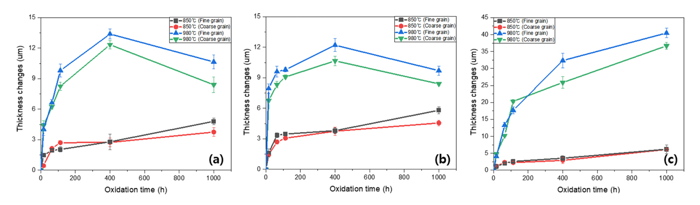 동일 온도에서는 미세 결정립 시험편이 조대 결정립보다 산화 속도가 빨랐으며, 이는 결정립을 제어하는 것이 산화 속도를 결정하는 주요한 요소임을 의미한다.