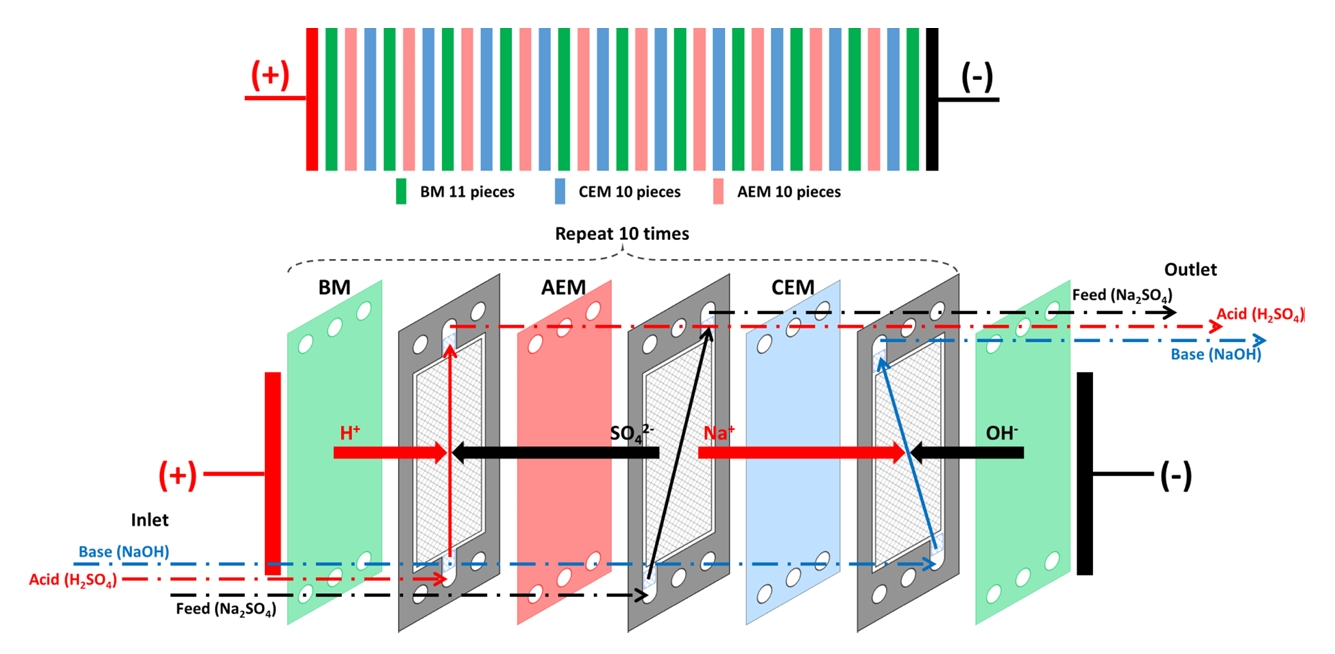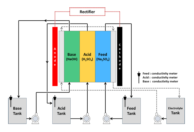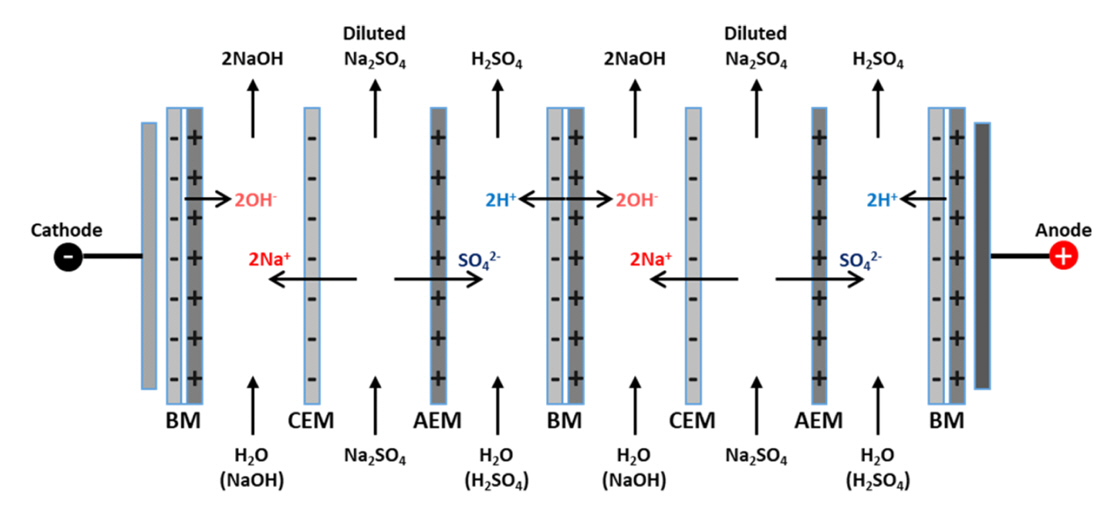 낮은 전압 조건에서 물을 분해할 수 있다. 전극으로부터 물의 분해가 아닌 바이폴라막 내부에서 물 분해를 통해 수소이온(H+)과 수산화이온(OH-)을 공급하는 역할을 한다. 바이폴라 전기투석 시스템에 의해 황산나트륨 용액을 처리하는 원리를 그림 1에 나타내었다. 원료(Feed) 용액으로 공급된 황산나트륨 용액중의 Na+와 SO42-이온은 각각 양/음이온교환막을 통과하여 분리된다. 동시에 바이폴라 막으로부터 물 분해 반응에 의해 생성된 수소이온과 수산화이온이 Na+와 SO42-이온을 만나 수산화나트륨(NaOH), 황산(H2SO4)이 생성되게 된다. 이렇게 회수된 수산화나트륨 및 황산은 순도가 높아 별도의 정제 없이 공정 중에 재사용 될 수 있고 또한 원료용액(폐수)중의 망초(Na2SO4) 성분은 탈염(Desalination)이 되기 때문에 공정수로 재사용이 가능하다는 장점이 있다.