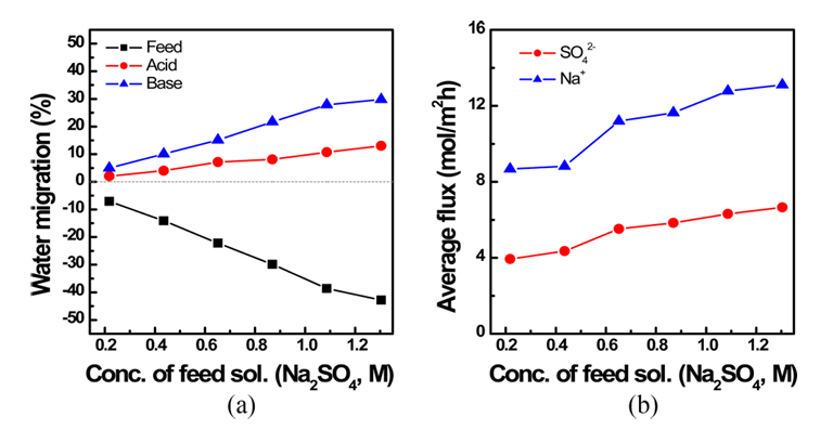 의한 물 이동률 차이는 일부 있으나 유사한 실혐 결과를 보였다. Na+ 이온과 SO42- 이온의 flux는 그림 5-(b)와 같이 원료 용액 농도 증가에 따라 증가하는 경향을 보였고, 1.09 M Na2SO4 이상에서는 flux의 증가폭이 감소하였다. 한편 표 4와 같이 0.22 M Na2SO4을 사용한 경우에 H2SO4와 NaOH의 회수율은 80% 이었으나 0.43 M 이상의 Na2SO4 용액을 사용할 경우에는 산 및 염기 모두 회수율이 93% 이상을 보여 원료 용액의 Na2SO4 농도가 증가할 경우 산 및 염기의 회수율은 증가하는 경향을 보였다. 실험 종료 시점으로 설정된 전기전도도가 원료용액의 탈염률에 영향을 미치기 때문에