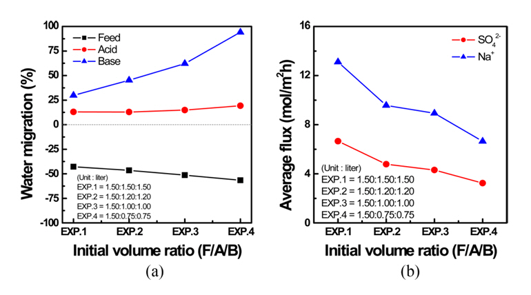 L 조건에서 염기 회수실 부피는 94% 증가하였다. 또한, 산회수실의 부피 증가는 13%에서 19%로 소폭 증가하였다. 그림 7-(b)의 경우는 Na+ 이온과 SO42-이온의 평균 flux가 부피비 감소에 따라 감소되는 경향을 나타내는데 산 및 염기 회수실의 부피를 1.5 L에서 1.2 L로 부피를 조절할 경우 평균