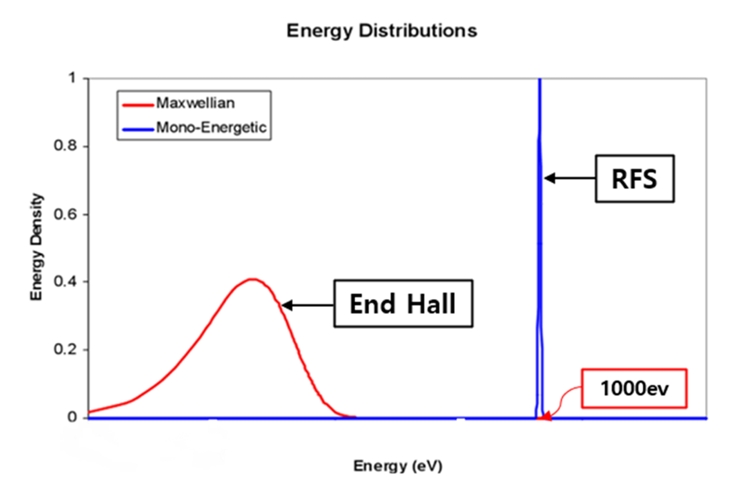 RF ion beam 방식이 있으며, RF ion source는 end hall ion source보다 에너지 분포가 좁고 ion energy 분해능이