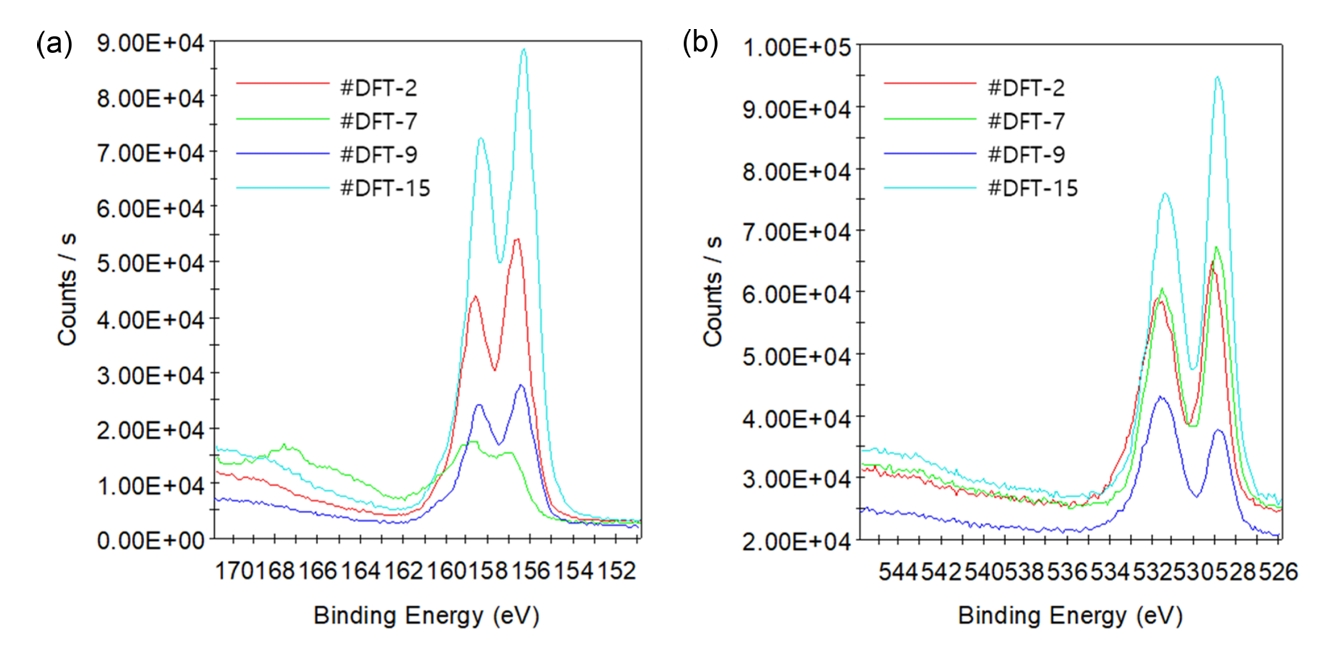 코팅한 Y2O3 시편의 평가에 앞서 기존 e-beam evaporation 방식의 문제점을 파악하기 위해 RF ion source없이 코팅한 Y2O3 시편(DFT-2, DFT-7, DFT-9, DFT-15)의 X-ray photoelectron spectroscopy(XPS) 분석을 진행하였다(그림 6). 각 시편의 XPS Y 3d spectra는 그림 6(a)에 표시되어 있으며, O 1s spectra는 그림 6(b)에서 확인할 수 있다. Y 3d, O 1s의 binding energy와 yttrium, oxygen 원소의 화학적 조성비는 표 2에 정리하였다. 결과적으로, IBAD 증착 방식이 도입되지 않은 모든 Y2O3 시편에서 yttrium과 oxygen 원소의 조성비는 2 : 3이 되지 않는 것을 확인하였다.