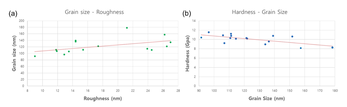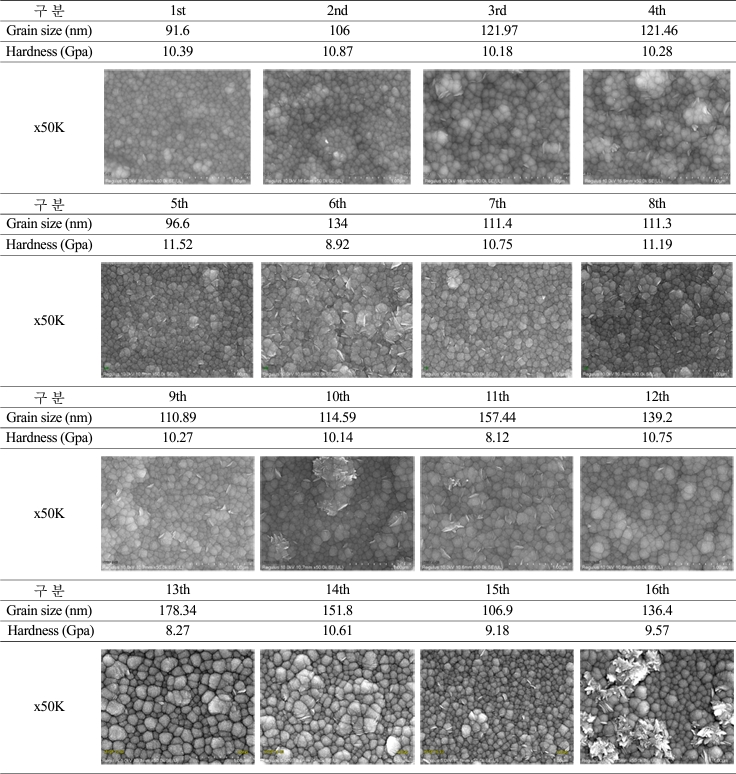 확인되었다. 각 시편 표면의 SEM 이미지와 grain size는 표 4에 나타냈다. 시편의 grain size는 1차 시편에서 91.6 nm로 가장 낮았으며, 13차 시편에서 178.34 nm로 가장 컸다.