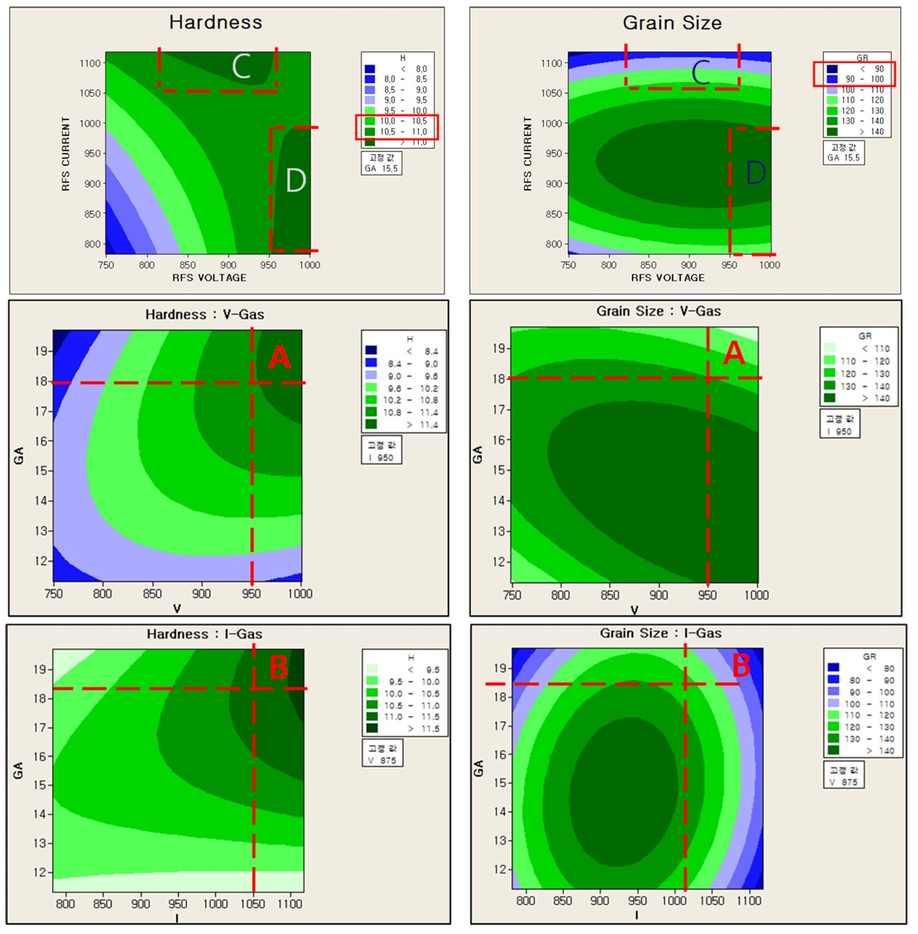 The RFS conditions of voltage, current, and gas ratio simulated from Minitab for the