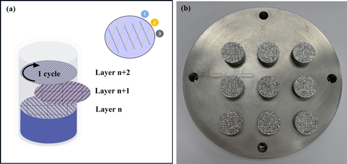 밀링 후 Sieve shaker를 활용하여 구형이면서 평균 입도 30 μm 이하의 분말을 선별하여 사용하였으며, 그림 1(b)와 같이 직경 150 mm, 높이 20 mm 크기의 Ti 기판 위에서 그림 1(a)와 같은 방식으로 쌓아 올려 직경 20 mm, 높이 10 mm 크기의 원기둥 형태의 벌크재를 제작하였다. 이후 제작된 Ti6Al4V-EB 복합재를