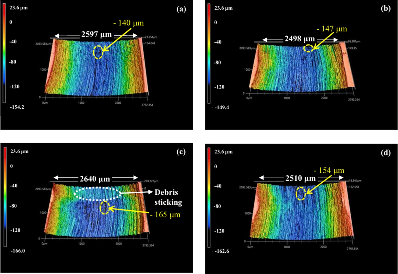 Analysis using 3D laser microscope; Worn surfaces of the (a) Ti6Al4V, (b) as-built