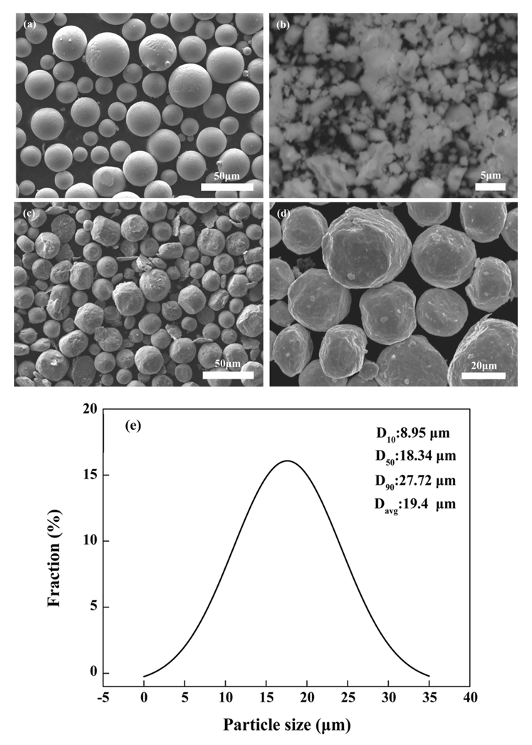 powder, Ti6Al4V-0.05EB, (d) high-magnification images of (c) and (e) Particle size