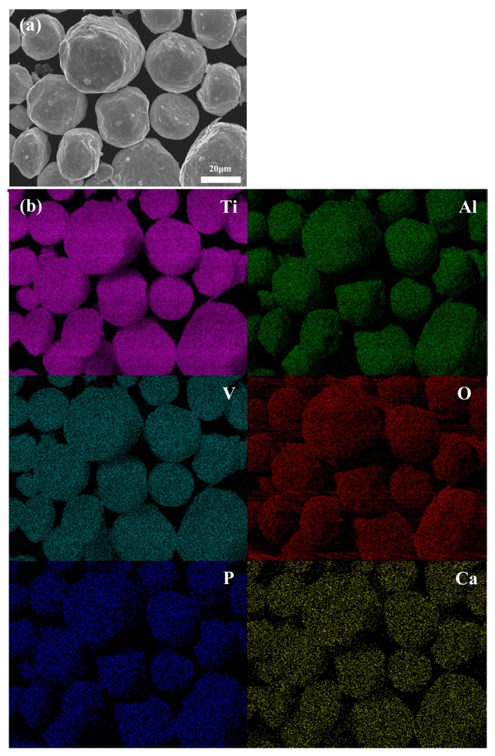 Ball-milled Ti6Al4V-EB powder; (a) SEM image, (b) EDS element mapping.