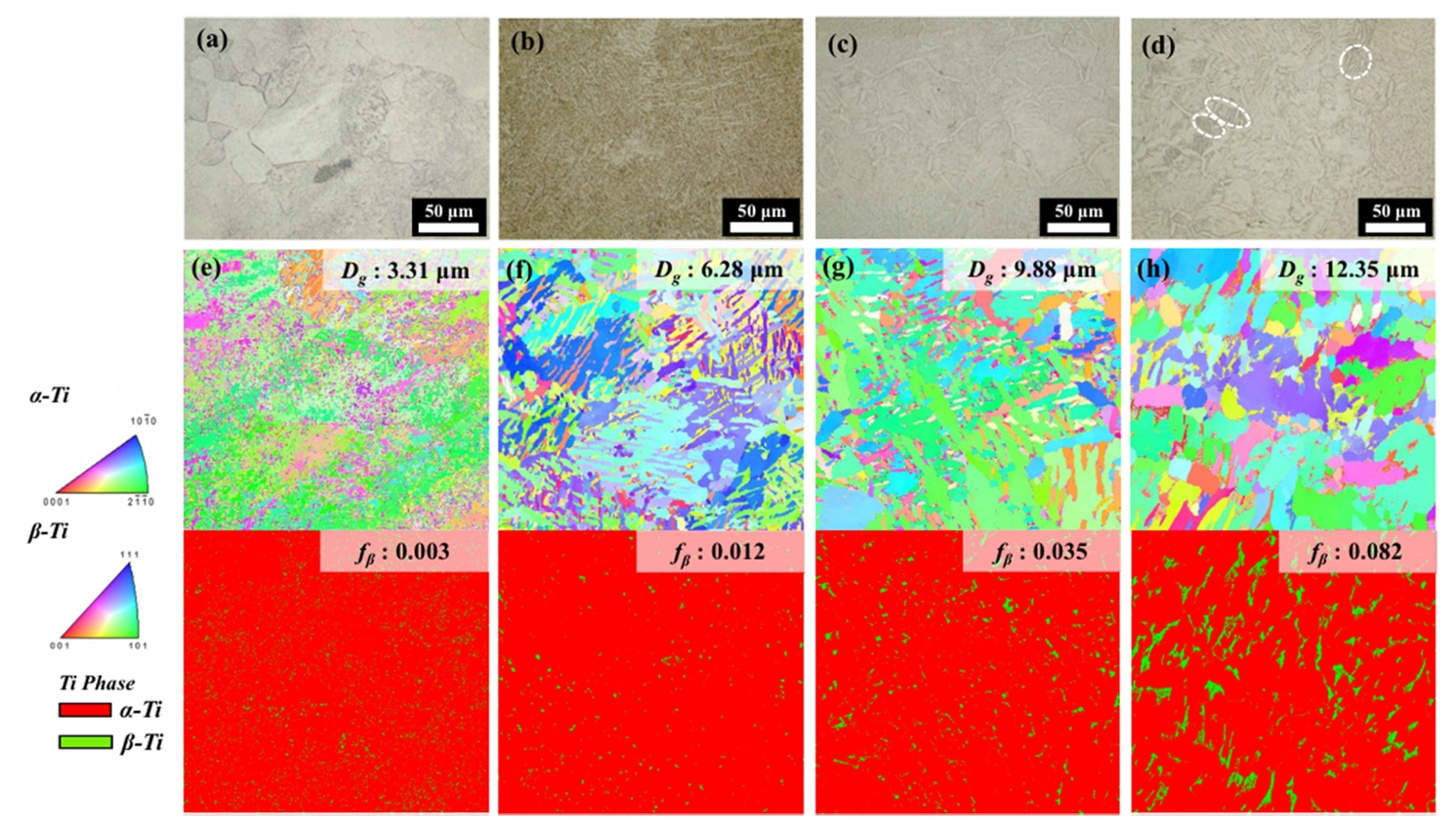 그 결과를 그림 5에 나타내었다. OM의 그림 (d)에서 표시된 부분이 변형된 β상인 α-Widmanstatten 상으로 α + β 층상구조가 관찰되고 있다[19,23-25]. 또한 EBSD를 보면 열처리전 평균 결정립 크기는 3.31 μm이며 열처리 후의 결정립 크기는 최대 12.35 μm로 약 4배까지 증가하였다.