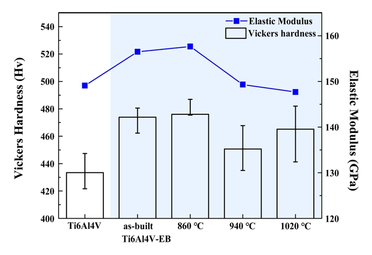 측정하여 그림 6에 나타냈다. as-built Ti6Al4V-EB, 860 °C, 940 °C, 1020 °C에서 열처리한 Ti6Al4V-EB의 Vickers hardness