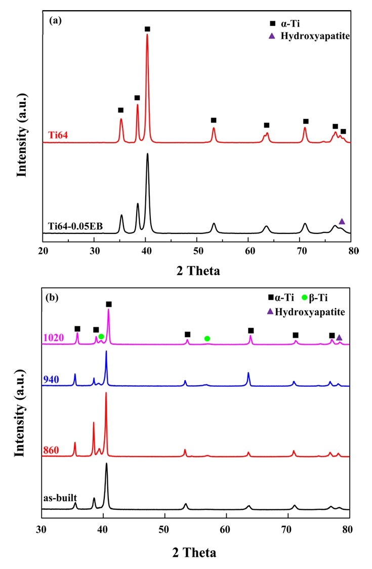 잔류 응력을 완화시킬 수 있다[15,20]. 또한 Ti6Al4V-EB의 열처리 온도가 860, 940, 1020 °C로 β상의 변태온도(998 °C)에 가까워질수록 β상 분율이 0.3 %(as-built)에서