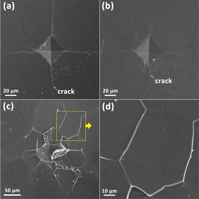 exhibited clear Vickers indentations, with cracks initiating from the diagonal ends