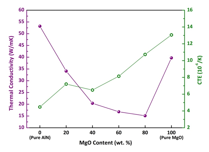 of 16.8 W/mK and a CTE of 8.14 ×10-6 /K. Thus, the variations in the thermal and mechanical properties of the AlN-MgO
