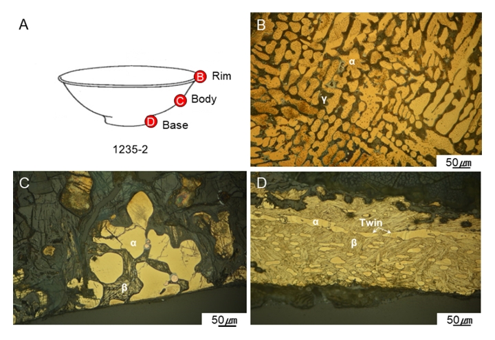수 있다. 구연부(B)에는 α상이 수지형상으로 존재하며 수지와 수지 사이에서는 다른 금속 조직이 존재하는데 이는 γ상이다. 동체(C)와 저부(D)에서 구상의 α상과 침상의 β(M)상이 존재하는데, 동체에 존재하는 α상의 크기는 저부의 α상보다 크다. 또한 저부의 α상은 길게 연신되어 있으며 결정립 내에서 쌍정이 관찰된다. 미세조직을 통해 청동용기(1235-2)의 제작 공정을 다음과 같이 추정할 수 있다. 먼저