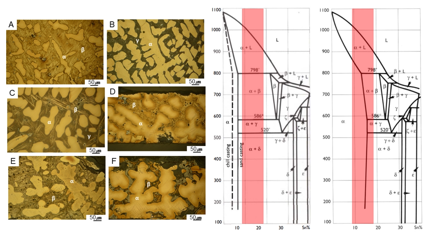 부여 관북리 백제유적에서 출토된 청동용기에서 확인되는 미세조직을 시편 채취 위치에 따라 정리했으며 이를 Cu-Sn 평형상태도에 대입한 결과는 그림 3과 같다. A와 B는 각각 다른 청동용기의 구연부에서 채취한 시편의 미세조직이다. A는 청동용기(1235-25)의 구연부로, 침상의 β(M)상을 바탕으로