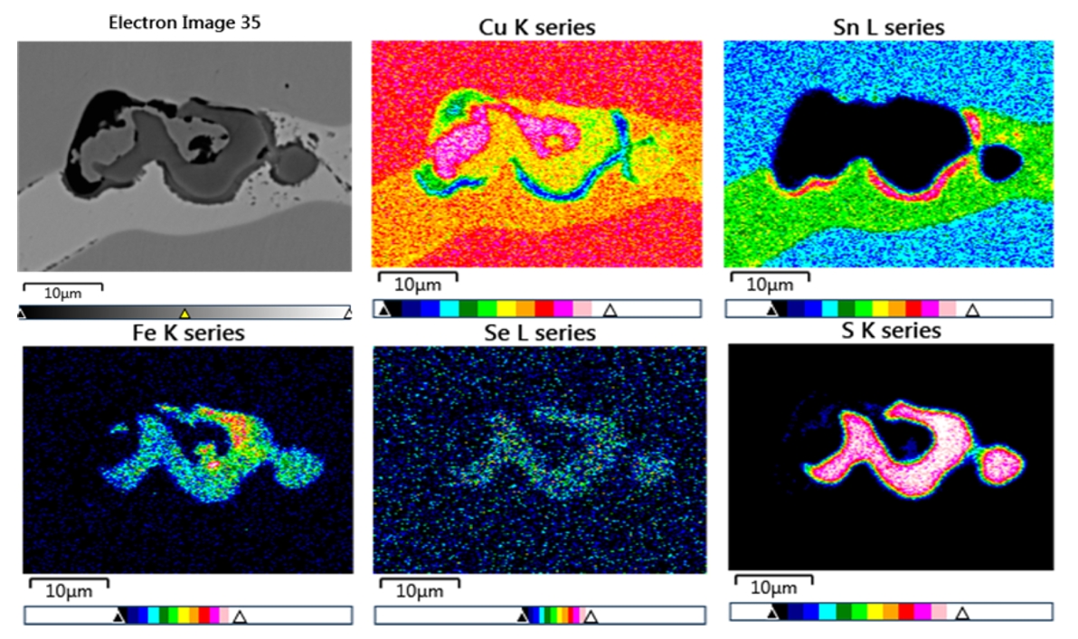 셀레늄화물의 형태로 들어 있어 이들 광석의 제련이나 정련의 부산물로 생산된다. 청동용기(1235-2)의 비금속 개재물을 EDS로 mapping한 결과