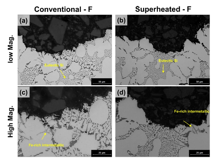 관찰한 그림 3(a2), (b2)를 보면 과열 처리를 실시한 합금(Superheated-F)에서의 공정 Si의 크기가 Conventional-F 합금과 대비하여 더 미세하게 형성되어