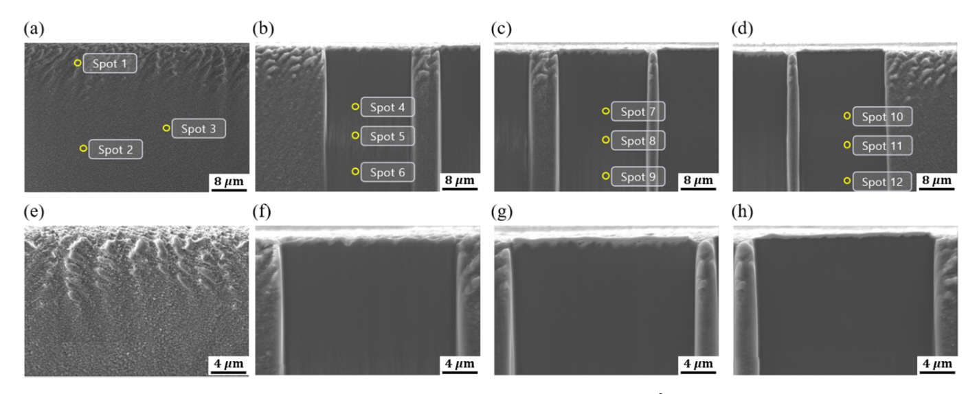 깊이까지 진행되었으며, EDS 분석을 통해 레이저 가공에 의해 발생한 산화를 확인하였다. EDS 분석 결과는 표 2에 나타내었다. 레이저 가공만 진행된 1번에서 3번 포인트(그림 11(a)) 모두 산소의 wt.%가 1.5% 이상으로 측정되었으며, 깊이 방향으로 FIB 밀링을 진행하고 표면을 측정한 4번에서 12번 포인트(그림 11(b-d)) 모두 산소의 wt. 는 1% 미만으로 측정되었다. 이를 통해 레이저 가공에 의한 실리콘 웨이퍼의 산화는 1 μm 미만인 것으로 판단된다. 그림 11(e-h)는 각각 그림 11(a-d)를 확대한 SEM 사진이다. 레이저 가공으로 제작된 측벽의 표면 및 1, 2, 그리고 3 μm 깊이로 FIB 밀링된 세 시편 모두에서 미세 크랙 및
