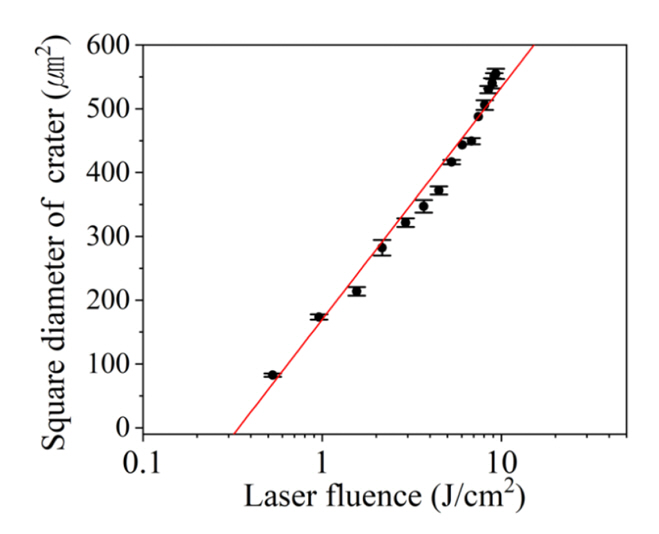 시편의 가공을 위하여서는 시편의 threshold fluence (Fth)를 넘는 fluence (F)로 가공을 수행해야 한다. 재료의 종류에 따라 Fth는 달라지며, F에 따른 실리콘 웨이퍼의 가공성을 관찰하기 위하여 단일 샷 가공을 수행하였다. 단일 샷 가공 후 실리콘 웨이퍼의 표면에 가공된 크레이터의 면적을 측정하고