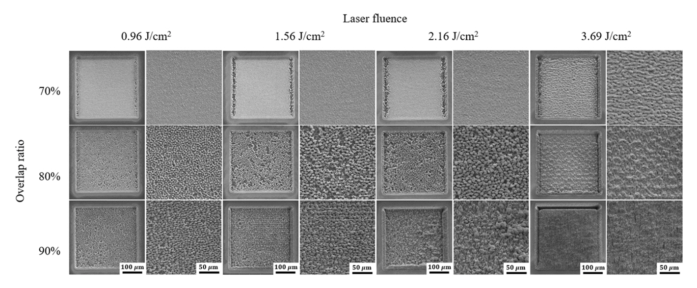 스캐너를 사용하여 영역 가공을 수행하였으며, 레이저 스팟 간 간격인 pulse overlap과 라인 간 간격인 pass overlap의 간격이 같도록