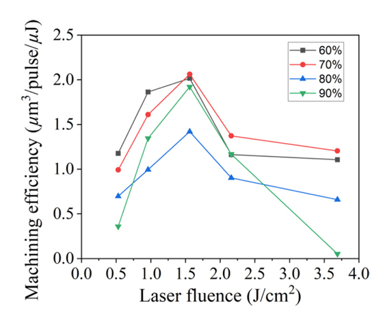 재응고로 마이크로 구조가 파괴되는 것에 기인한다[45]. 그림 4는 F 및 η에 따른 가공 효율을 나타낸 그래프로 광학 현미경을 통해 제거된 영역의 부피를 측정하고 이를 활용하여 가공 효율을 계산하였다. 가공 효율은 F=1.56 J/cm2 조건에서 가장 높으며 이는 대비 약 5배로 기존에 진행된 연구들과 상응하는 결과이다[46,47]. 모든 η 및 F = 1.56 J/cm2 이상 조건에서 가공 효율은 감소하기 시작한다. 이러한 현상은 과도한 로 인한 가공 영역의 용융 및 재응고로 인한 표면 융기[45,48]와 앞선 펄스에 의해 발생한 particle plume이 다음 펄스에 의해 시편에 재증착된 것[49]에 기인한다.
