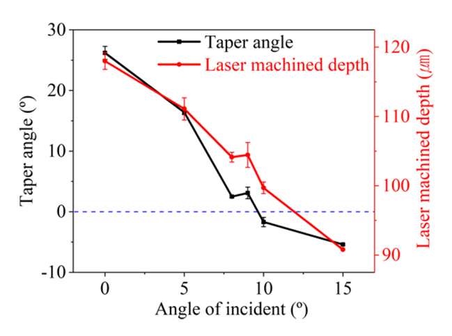 AOI를 적용하지 않고 레이저 가공을 수행한 경우(AOI = 0°) 테이퍼 각도 27.9°의 측벽을 수직벽으로 만들기 위하여 약 54 μm 깊이의