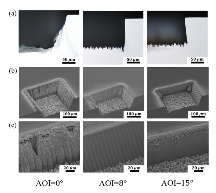 것을 확인할 수 있다. 그림 7(a)는 AOI 적용에 따른 측벽 단면의 광학 현미경 사진을 나타내며, 그림 7(b) SEM으로 촬영된 측벽 사진이다. 8° 이상의 AOI를 적용하여 가공을 진행하게 되면 오버행 구조가 발생함과 동시에 측벽 상단부의 가공 품질이 감소하고