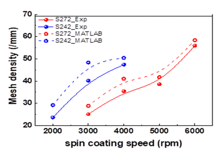 rpm으로 증가하면서 밀도가 23.6, 40.2, 47.4 /mm로 증가하였다. 동일한 스핀 코팅 속도 조건으로, S242_MATLAB에서 스핀 코팅