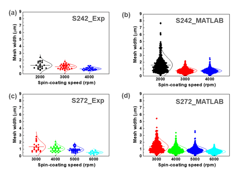 그림 5(a)에서 S242_Exp는 수작업을 통해 측정한 Ag-mesh의 평균 너비를 나타낸 것으로, 스핀 코팅 속도가 3000 rpm에서 6000 rpm까지