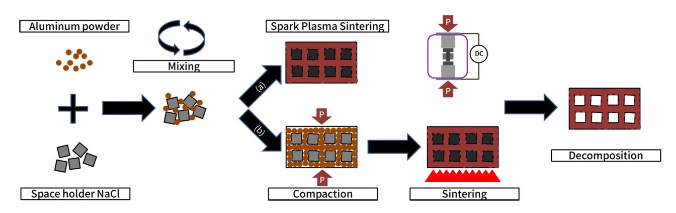 Al foam, Spark plasma sintering, Compression molding, Space holder technique, Powder metallurgy