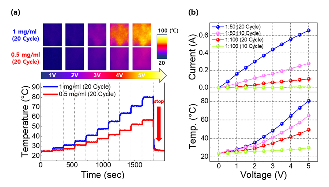 핵심연구지원센터)을 이용하였다. 줄 발열 (Joule heating) 테스트는 외부 전력 공급장치 (EPS-3305, EZT)를 이용하여 인가전압을