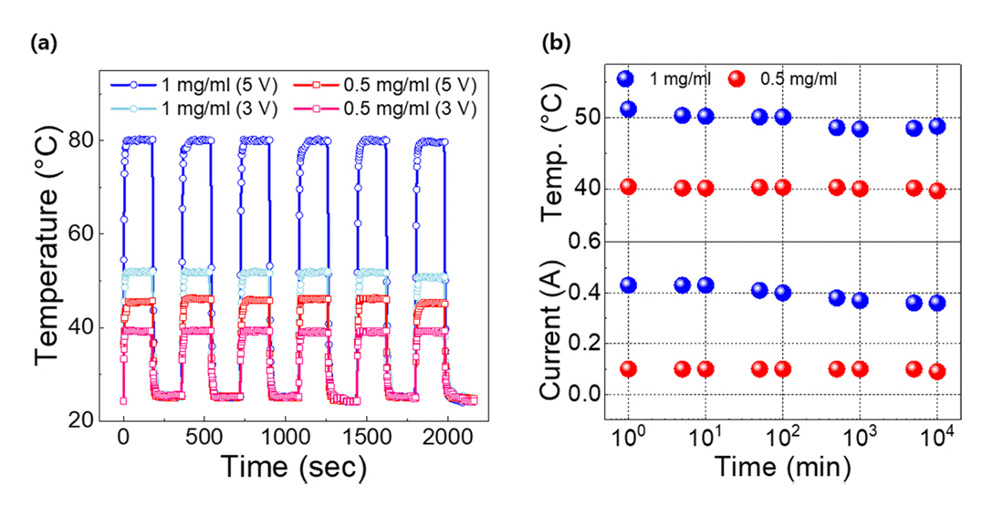 40 °C 이하에서 장시간 (10,000분) 연속 발열 시에도 발열 특성의 변화가 관찰되지 않았으나, 그 이상의 온도에서는 미세한 (~5%) 전류