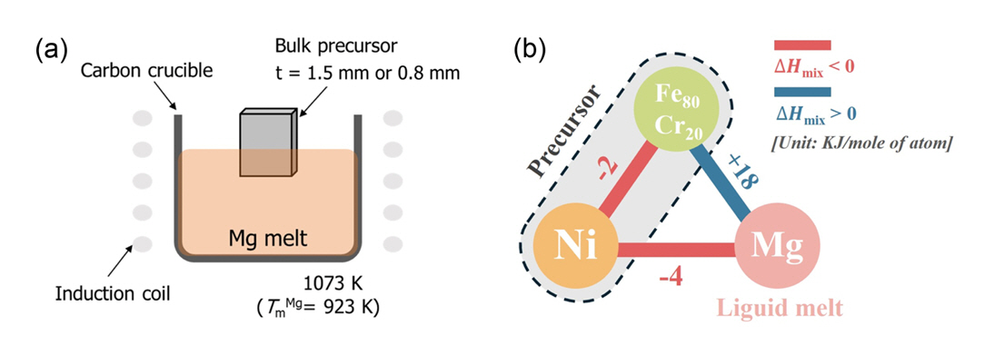 ์ฒ์ ํ๊ณ์ ๋ณด๊ณ ํ ํ์ฑ๋ถ ๊ณต์ ์ผ๋ก, ๊ธฐ์กด์ ํํ์ ํ์ฑ๋ถ๋ฒ(Chemical dealloying)๊ณผ๋ ๋ค๋ฅด๊ฒ ๊ธ์์ฉํ์ ํ์ฑ๋ถ ๋งค๊ฐ์ฒด๋ก ์ฌ์ฉํ๋