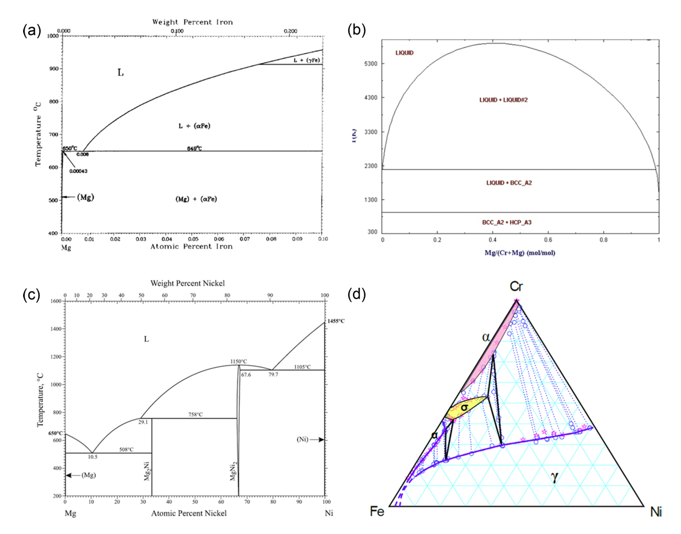 Binary and ternary phase diagrams of (a) Fe-Mg [32], (b) Cr-Mg [33], (c) Ni-Mg [34] and (d) Fe-Cr-Ni [35].